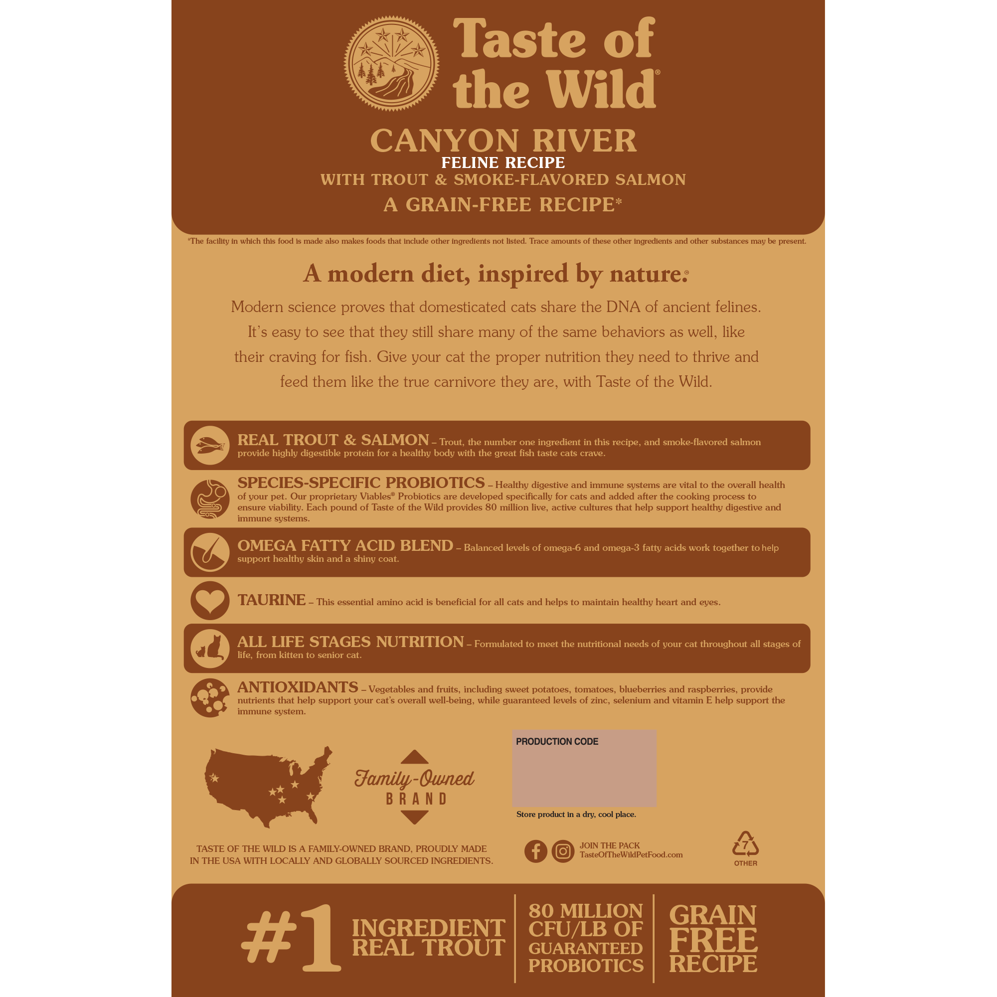 Taste of the Wild Canyon River Feline Recipe is formulated to meet the nutritional levels established by the AAFCO Cat Food Nutrient Profiles for All Life Stages.