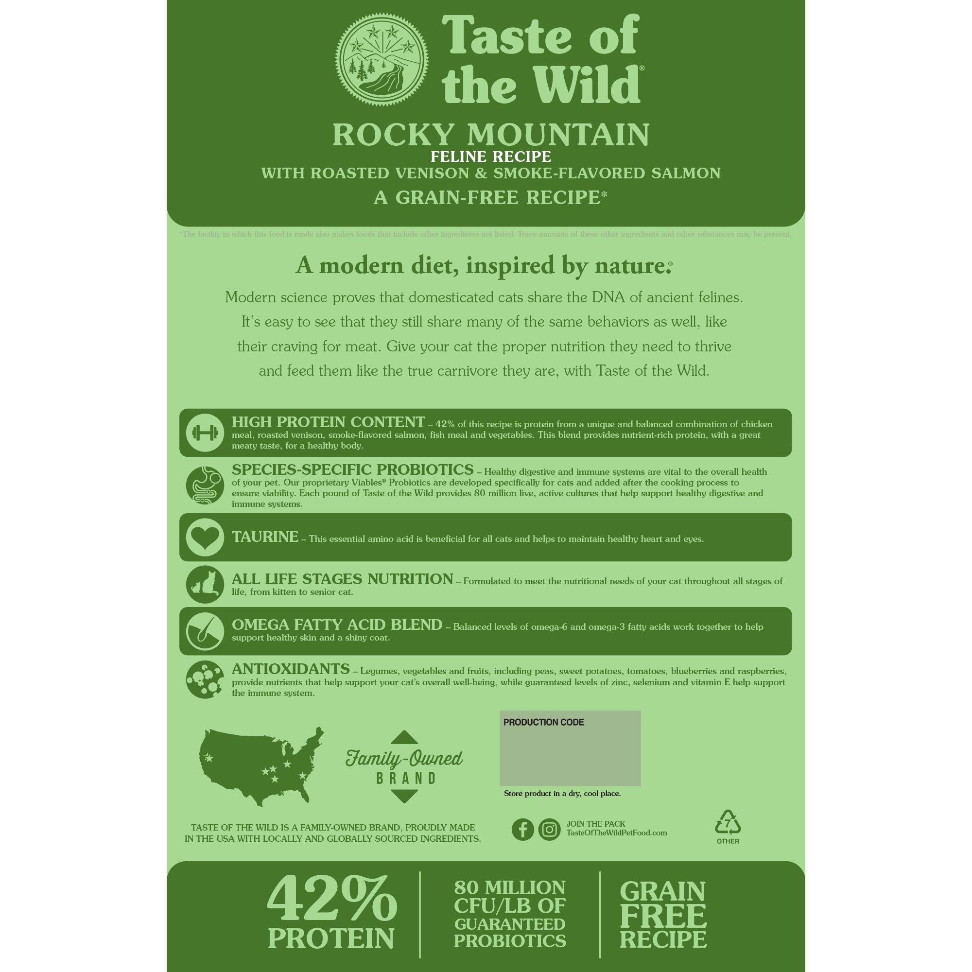 Taste of the Wild Rocky Mountain Feline Recipe is formulated to meet the nutritional levels established by the AAFCO Cat Food Nutrient Profiles for All Life Stages.